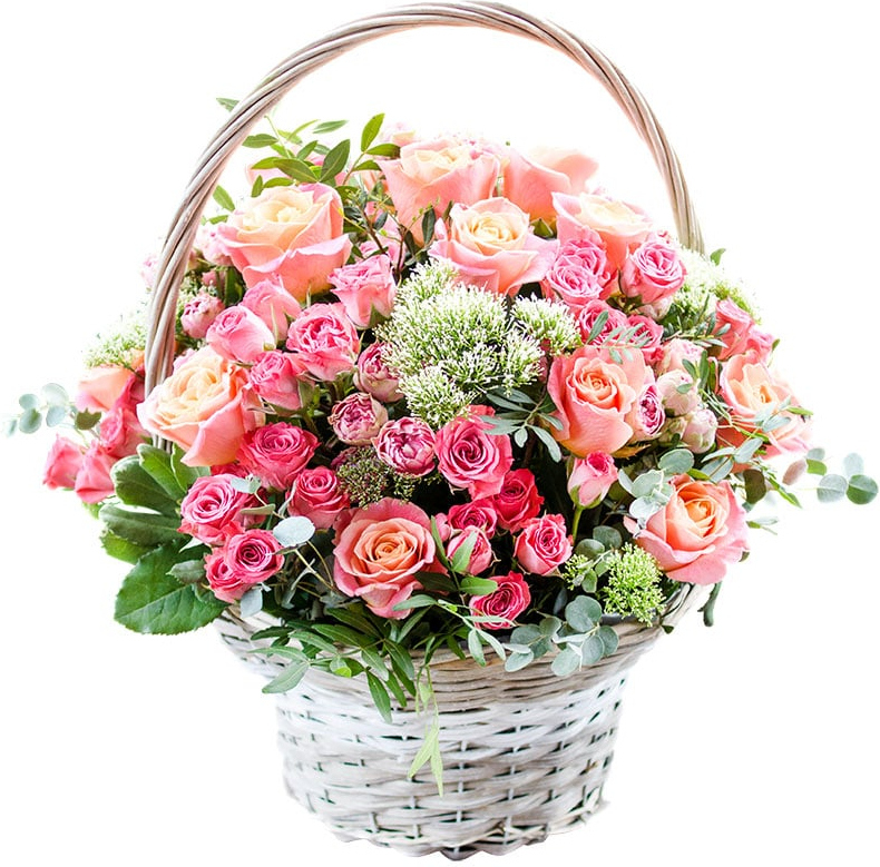 21 персиковая роза, 15 кустовых розовых роз, зелень, оазис, корзина27 персиковая роза, 20 кустовых розовых роз, зелень, оазис, корзина